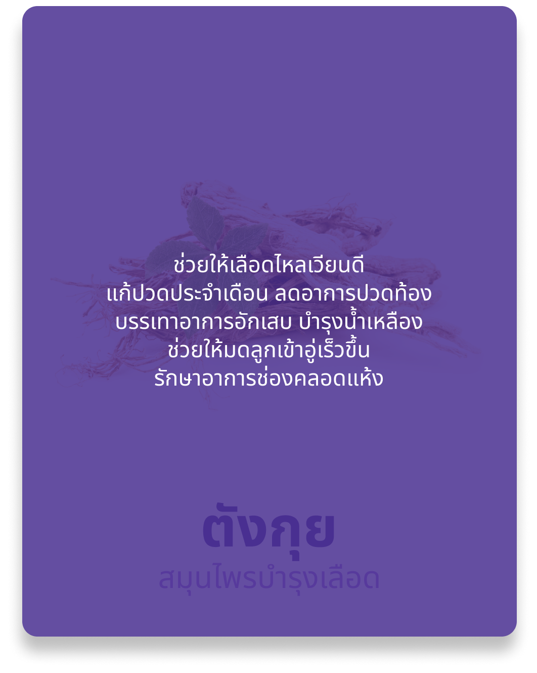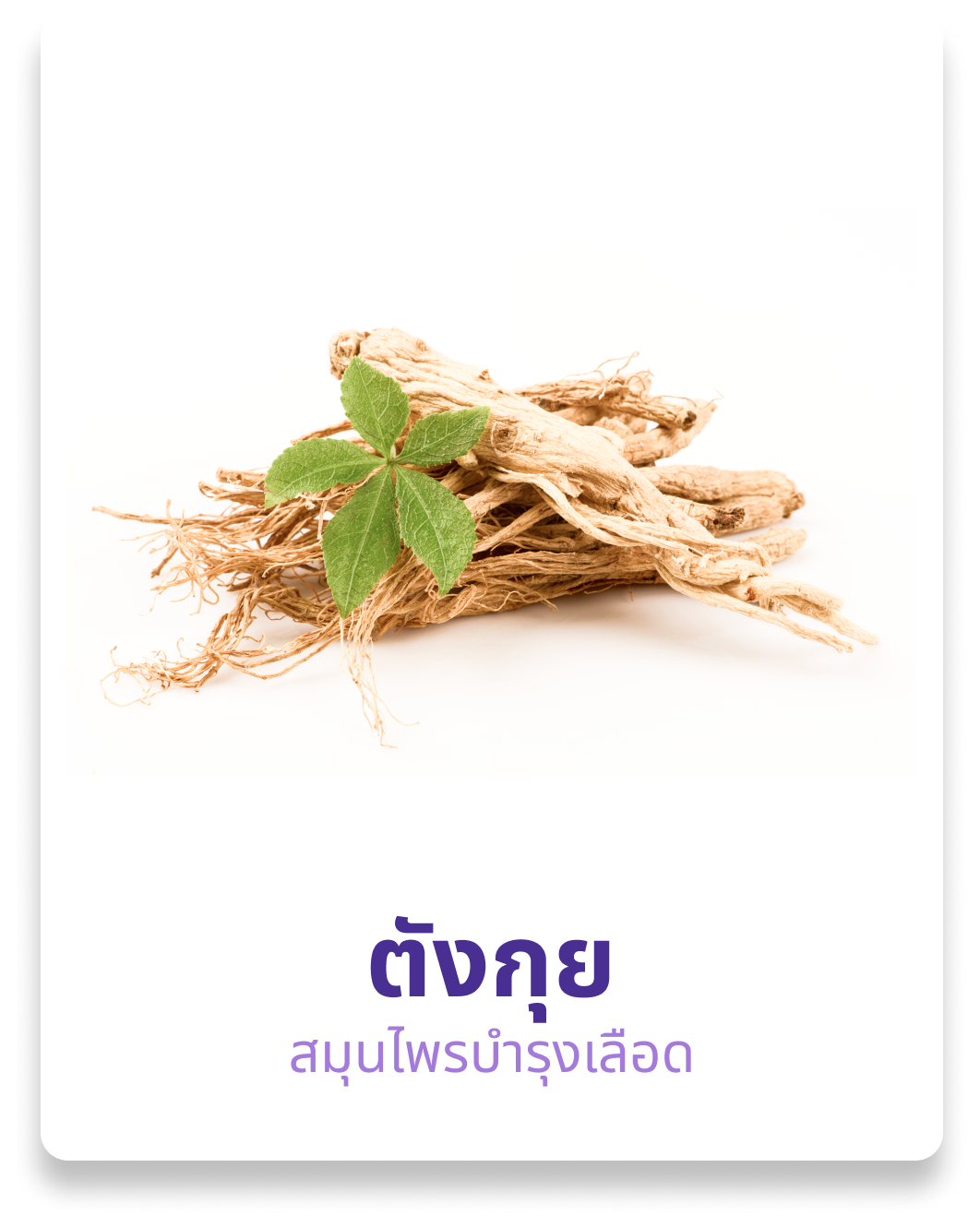 4. ตังกุย เหมาะสำหรับสตรีหลังคลอด ช่วยกระตุ้นการไหลเวียนเลือด ขับน้ำคาวปลา ช่วยให้มดลูกกระชับขึ้น